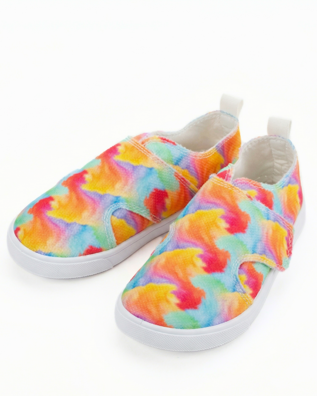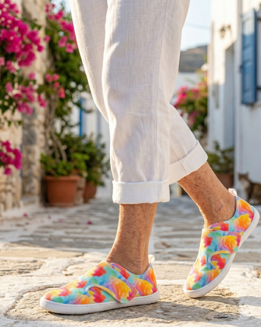 Zapato de lona con pala de velcro a cada lado. Fáciles de calzar.