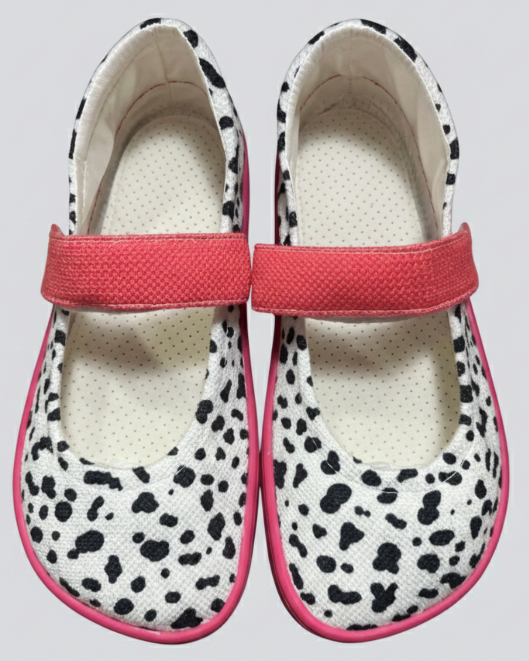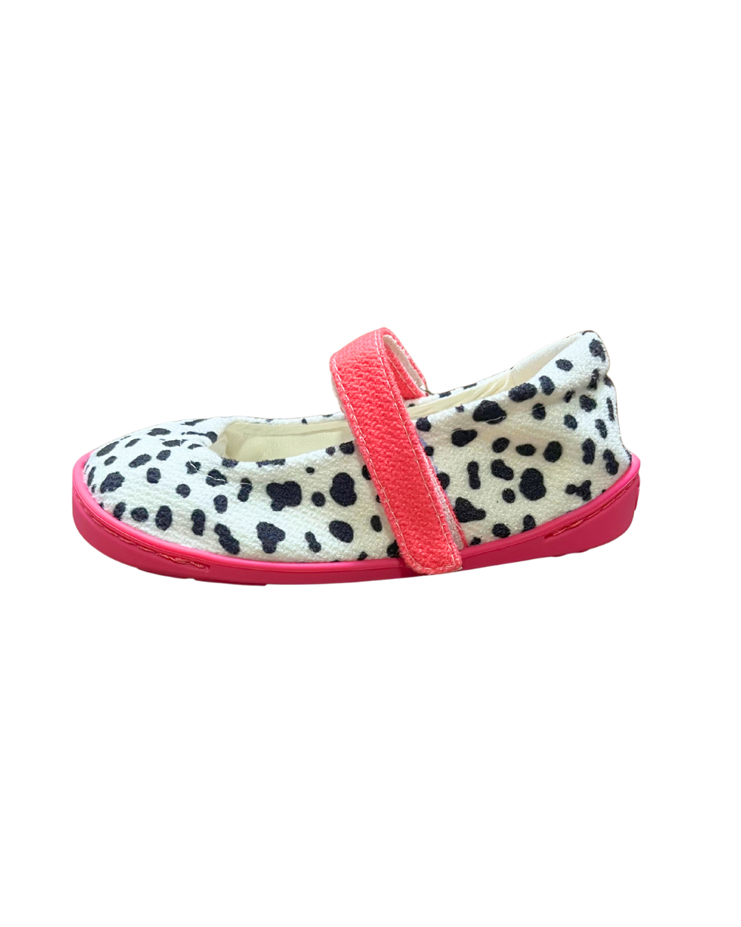 Tela blanca con motas negras y suela y correa de velcro fucsia.